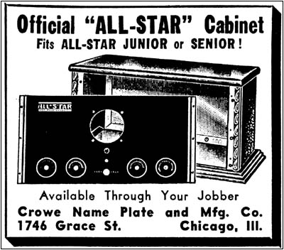A complete All-Star kit included a prepunched and drilled front panel and chassis, along with all components and hardware. Tubes and speaker were extra, as was typical of the period. Alternatively, builders could elect to purchase a "foundation kit" consisting of just the chassis and front panel at a cost of $2.50, and then choose their own parts sources. An optional wood cabinet for the All-Star was offered by Crowe Name Plate and Mfg. Co., as shown in Figure 4.
