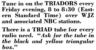 Figure 5. Madison Avenue sales gimmicks were alive and well in 1929 -- the Triad tube had the Triadors singing its praises every Friday evening on NBC stations. (Dick Desjarlais, Box 629, Littleton, MA 01460)