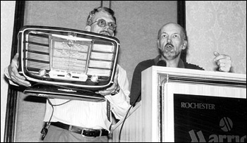 Figure 3. Auctioneer Walt Buffinton takes bids on the unique Russian Red Star radio. The winning bid was $1,050!In the vacuum tube auction, the top sellers were two DeForest spherical Audions at $550 and $410. (It is rumored that an outstanding example of a spherical Audion sold in the flea market for $1,500.) The auction prices were down from the $1,750 price of last year because both tubes had significant problems. A beautiful Daven amplifier, complete with red, white and blue Sonotron tubes, sold for $400.